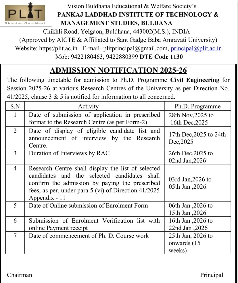 Education is one of the major tools for development of society and we at Vision Buldana Educational and Social Welfare Society, Buldana decided to establish an institute for technical education in the name of Pankaj Laddhad Institute of Technology and Management Studies, sited with a close proximity to Buldana town.Our objective is to set bench mark in imparting engineering education by adopting latest tools & techniques and the approach in lines with that available at IITs. The Principal has immensely contributed Read More